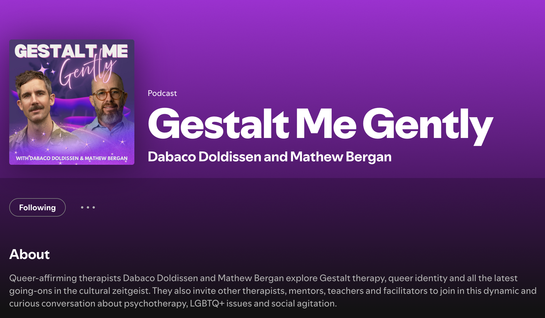 Queer-affirming therapists Dabaco Doldissen and Mathew Bergan explore Gestalt therapy, queer identity and all the latest going-ons in the cultural zeitgeist. They also invite other therapists, mentors, teachers and facilitators to join in this dynamic and curious conversation about psychotherapy, LGBTQ+ issues and social agitation.